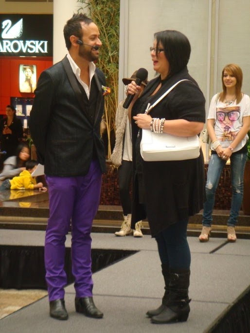 Going to LA Fashion Week Outfit: Contestant Camila and Nick Verreos during the Project Style Trendsetter FinalsThe event was being held smack dab in the "Center Court" area of the South Bay Galleria. At one point, as I got up on the runway stage, I looked up, and there were four levels with tons of shoppers looking down from the balconies--to see what was happening "down there". Near the stage, lots of friends and family members of the Finalists were positioning themselves to best root for their girl!